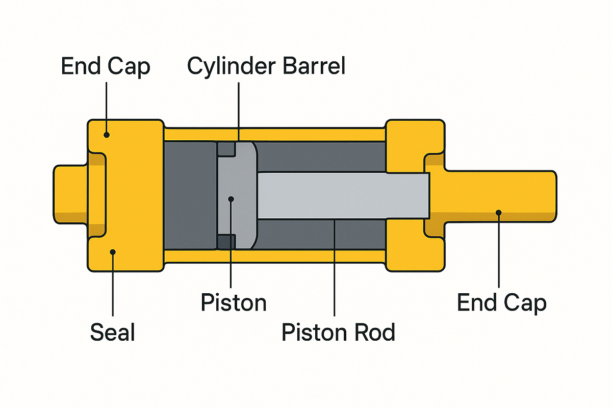 Figure 1: Basic structure of a hydraulic cylinder showing key components. Os cilindros hidráulicos são os poder por trás da maquinaria moderna , convertendo a pressão hidráulica em movimento linear controlado. Eles são cruciais na construção, manufatura, agricultura, transporte e aeroespacial. Ao compreender os diferentes tipos, princípios operacionais e aplicações de cilindros hidráulicos, engenheiros e operadores podem maximizar eficiência, confiabilidade e segurança em operações de máquinas.